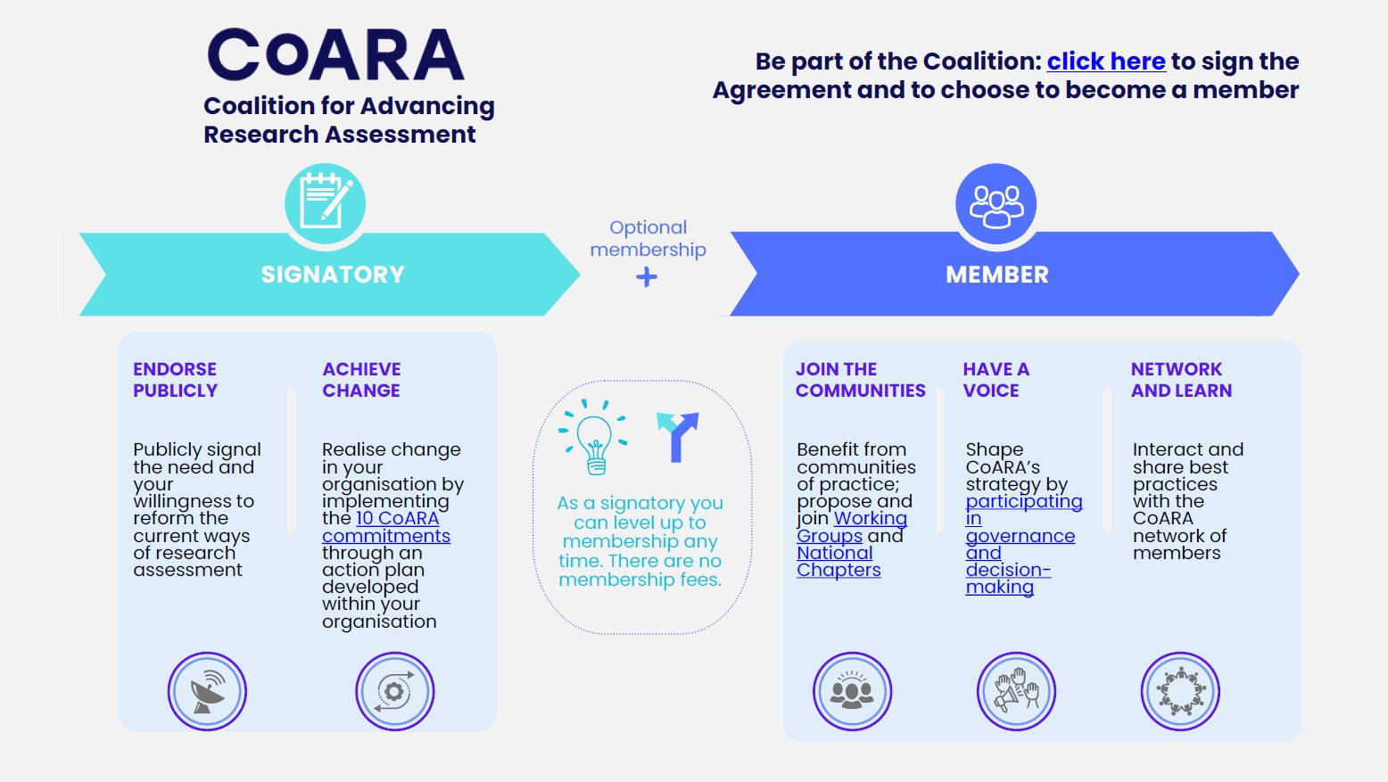 To provide more information including the benefits and distinctions between signatory and membership status, CoARA makes available an informative graphic. This resource outlines the responsibilities associated with each status, helping prospective members or signatories to make informed decisions about their involvement with the coalition.